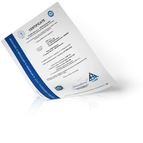 Společnost HTP s.r.o. má zaveden systém managementu kvality a environmentu podle EN ISO 9001 : 2015, resp. EN ISO 14001 : 2015, včetně vyšších požadavků na kvalitu při svařování podle norem EN ISO 3834-2 : 2005 a EN 15085-2 : 2020 v úrovni CL1.