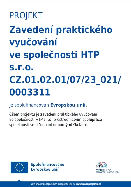 Projekt Zavedení praktického vyučování ve společnosti HTP s.r.o. CZ.01.02.01/07/23_021/ 0003311 byl spolufinancován Evropskou unií.